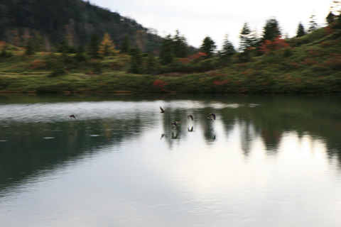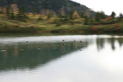 頂上の湿地では、ちょうど鴨が羽ばたく瞬間をとらえました。