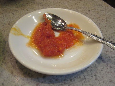 ↓のようにトマトのタレをつけて食べます。
